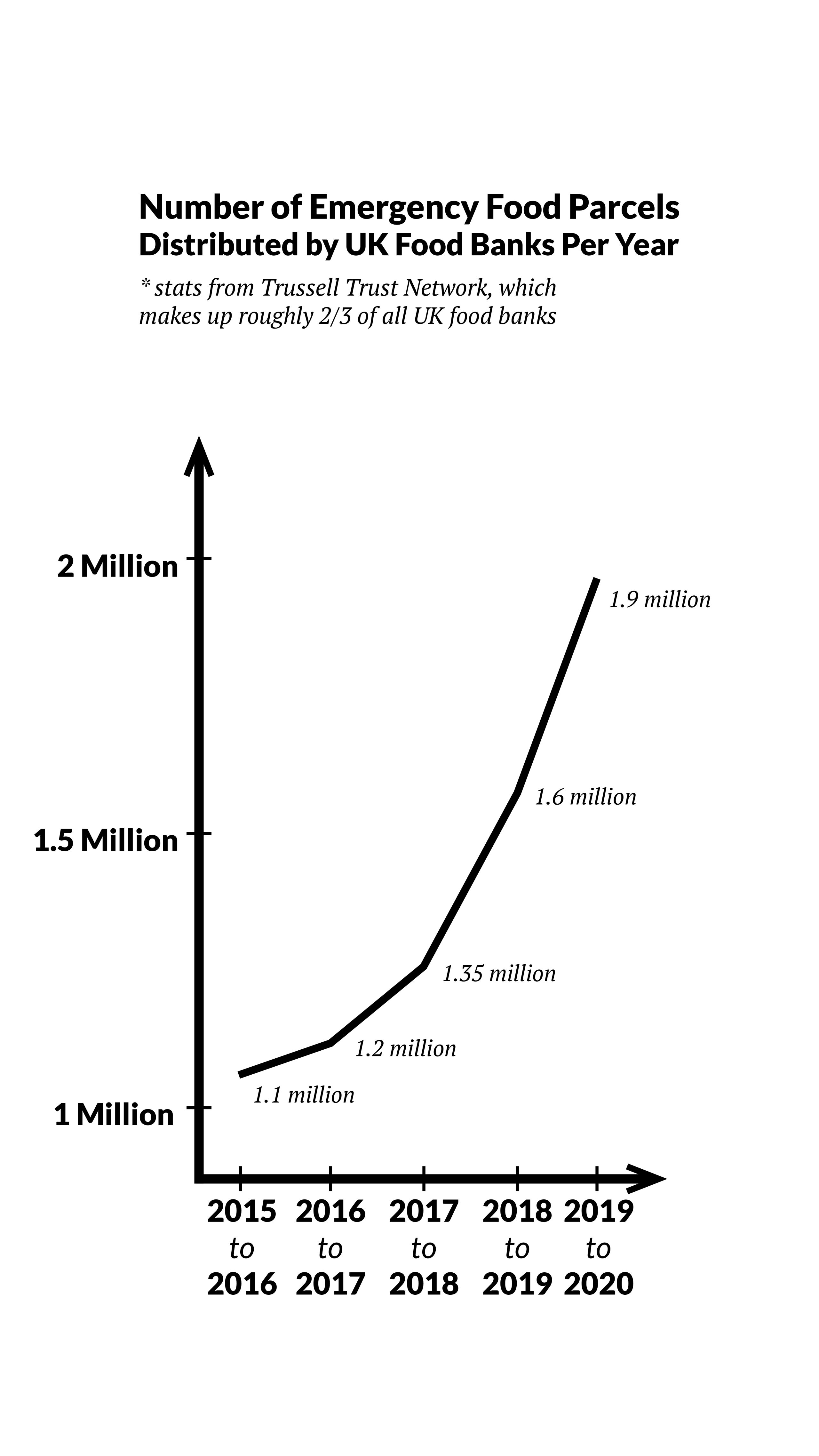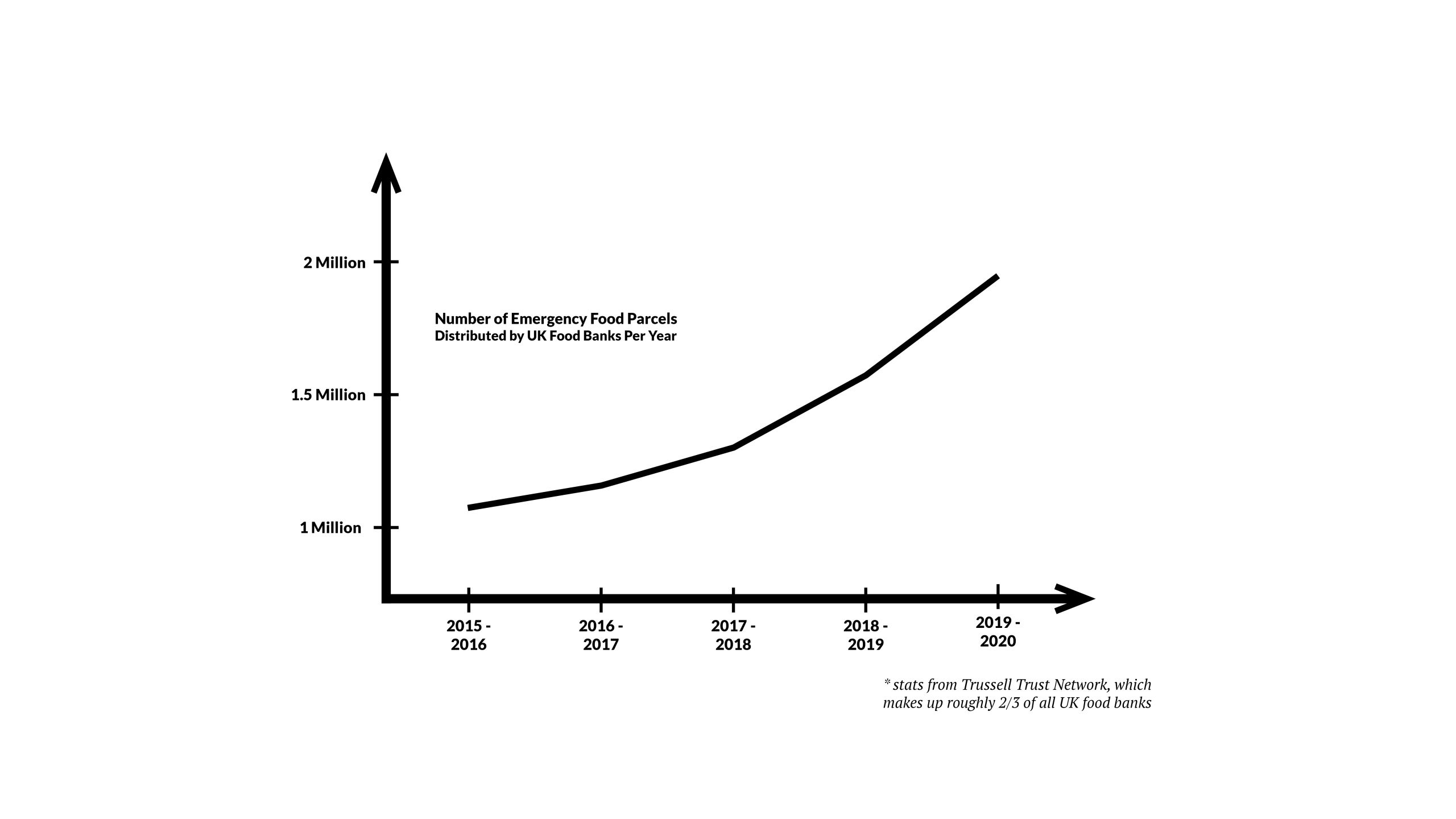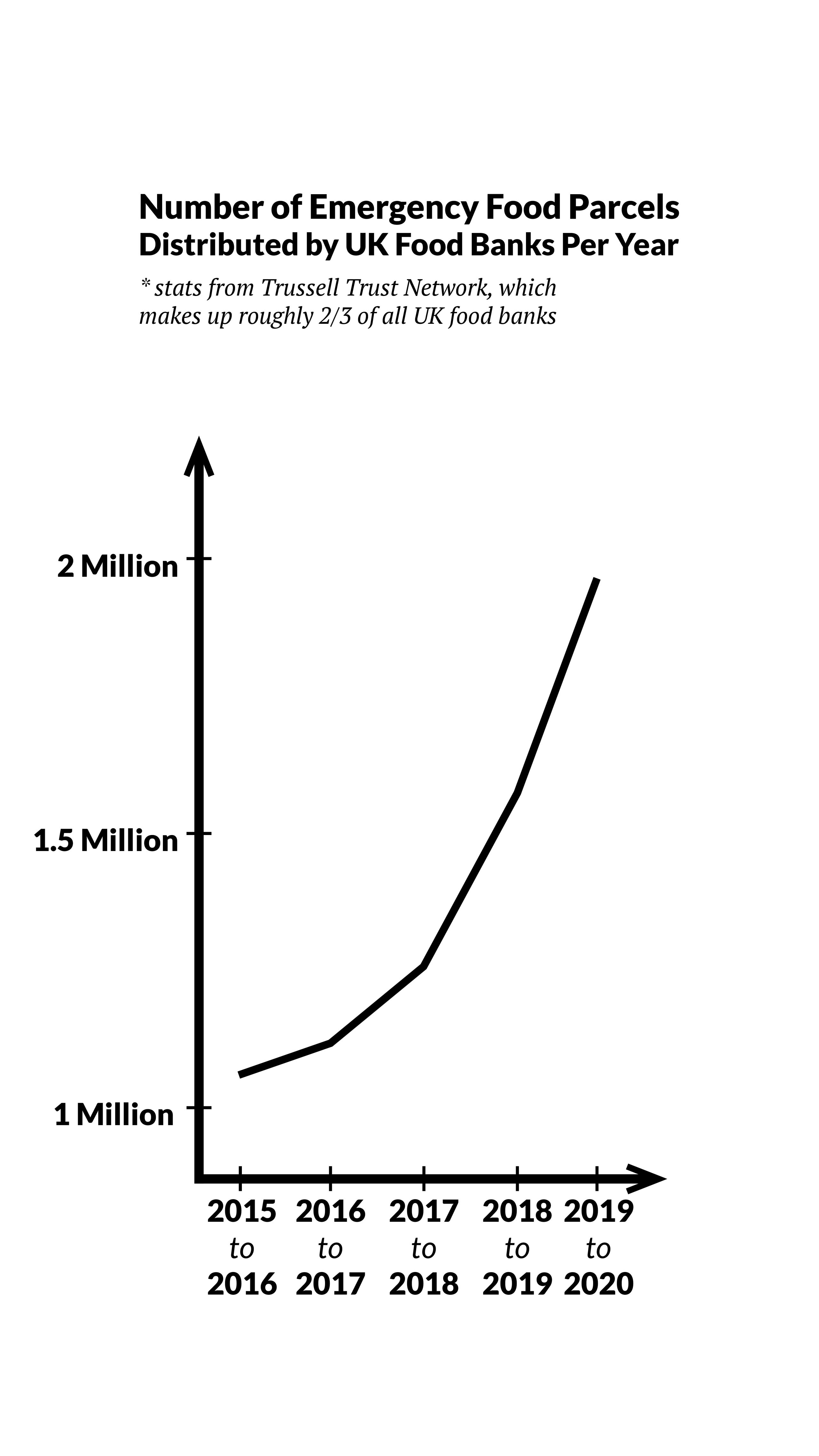 Before the pandemic, The Trussell Trust, an organisation responsible for two thirds of the UK’s food banks, revealed that they’d seen an increase of nearly 75% of food parcel distribution from 2015 to 2020. More worryingly, this statistic was released in March 2020, before the virus really took hold in the UK.