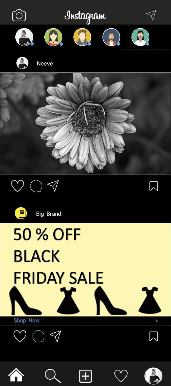 An observation from my own Facebook timeline is similar to my Instagram observation. I found that I was getting an advertisement exactly every 4 posts. Most of the adverts were scrolling thumbnails for products, so one advert scrolled horizontally to accommodate for more space for products and a shop now link. Again every 4 posts are way too frequent to be healthy. The social media companies such as Facebook are constantly bombarding you with advertising and trying to get you to spend your money so that they in turn can make money.