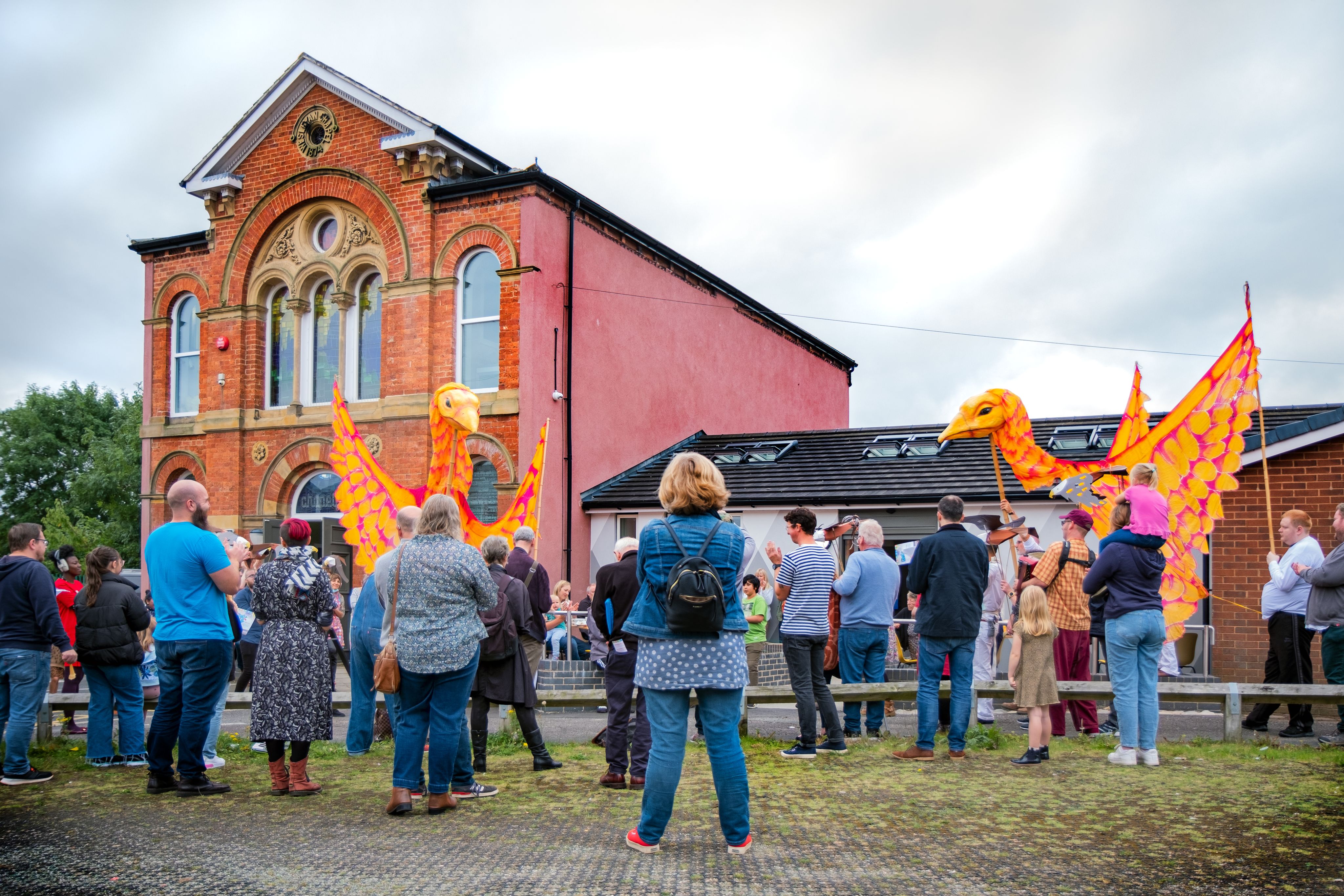 Large, brightly coloured phoenix puppets danced around the village green, putting smiles on the faces of those sitting in nearby pubs and homes.