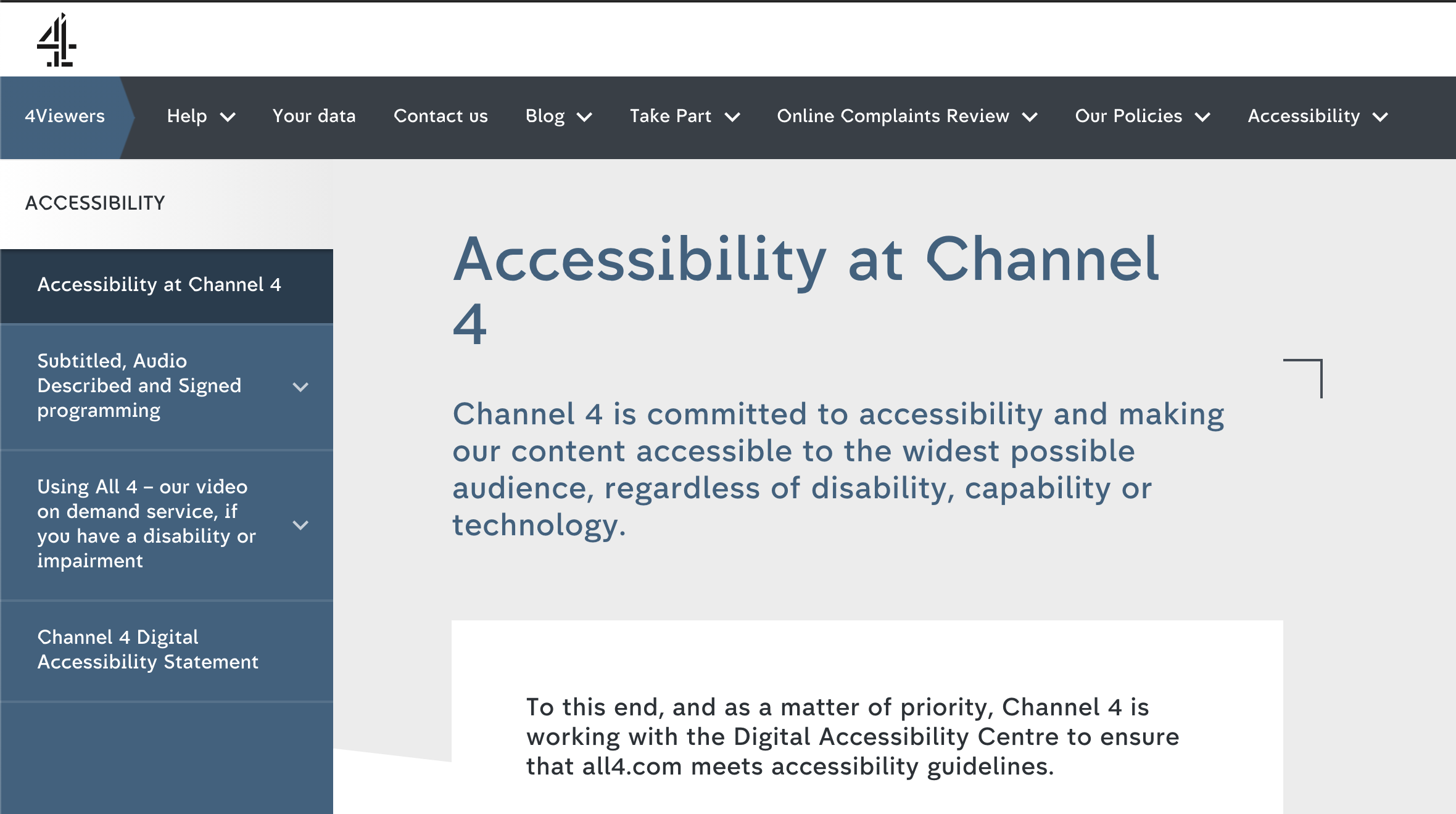 "Channel 4 is committed to accessibility and making our content accessible to the widest possible audience, regardless of disability, capability or technology."