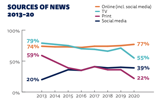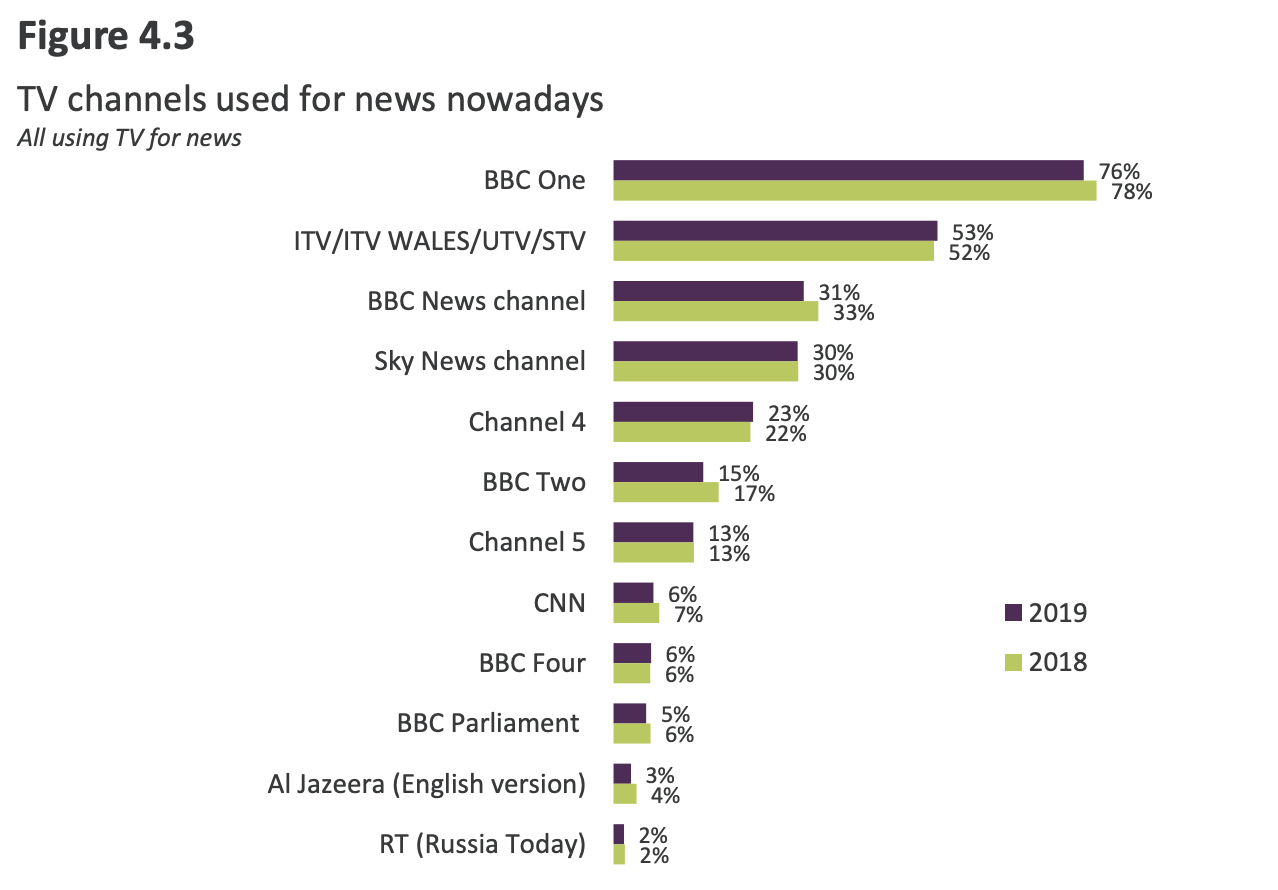 Still going strong, despite the surge in online news, is television. As of 2019, 75% of UK adults consume their news through television; a 4% drop from 2018. Perhaps unsurprisingly, that statistic includes 94% of over 65s.
